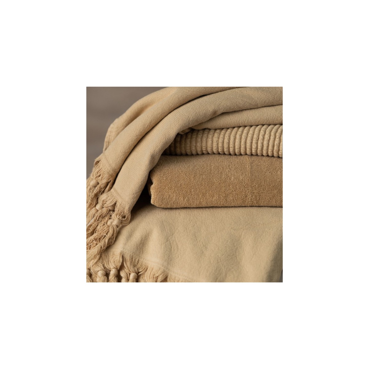 The stone washing process softens the cotton fibres and increases the fabric’s flexibility. Our Nutmeg Vintage Wash Towel Collection is flat-woven on one side, with a short terry weave on the other.